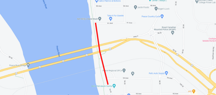 Please be advised that a portion of 94 Street – from 91 to 94 Avenue – will be closed Wednesday, September 14 to Saturday, September 17 to facilitate the installation of girders for the Peace River Bridge rehabilitation project.