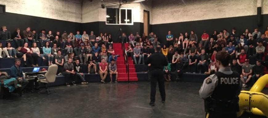 On March 31st, members of the Peace River RCMP detachment, Alberta Health Services EMS and the Peace River Fire Department presented information sessions regarding ice safety to local students.  The sessions included information regarding what to expect if you fall through the ice and procedures for self-rescue, statistics on injuries and deaths related to ice and cold water, and how ice rescues are performed.  The group made five presentations at TA Norris Middle School, Glenmary High School and Peace River High School.