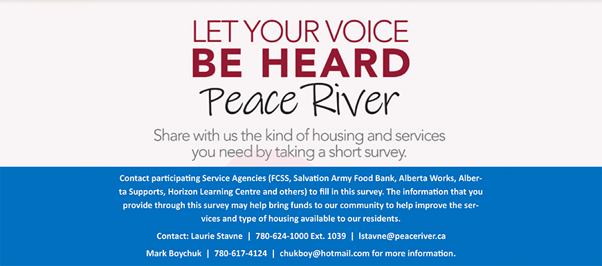 Along with 26 other rural Alberta communities, Town of Peace River FCSS will be collecting resident feedback over October 1 and October 31, 2020. The survey will be administered by local service providers – food banks, FCSS, Alberta Works, Horizon Learning Centre, etc. — and will be available digitally/online or through paper surveys.