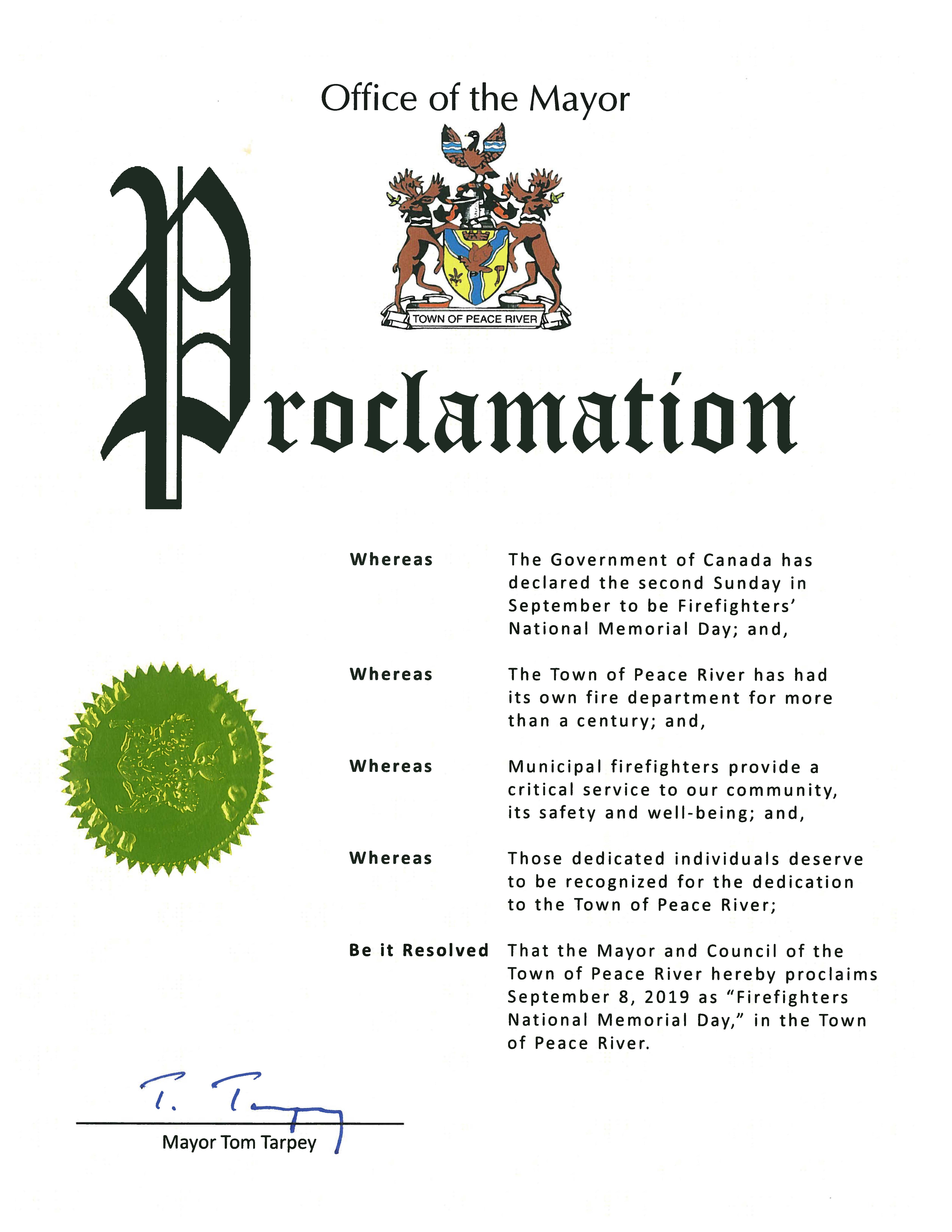 The Mayor has Proclaimed Sunday, September 8 as Firefighter’s National Memorial Day in the Town of Peace River.