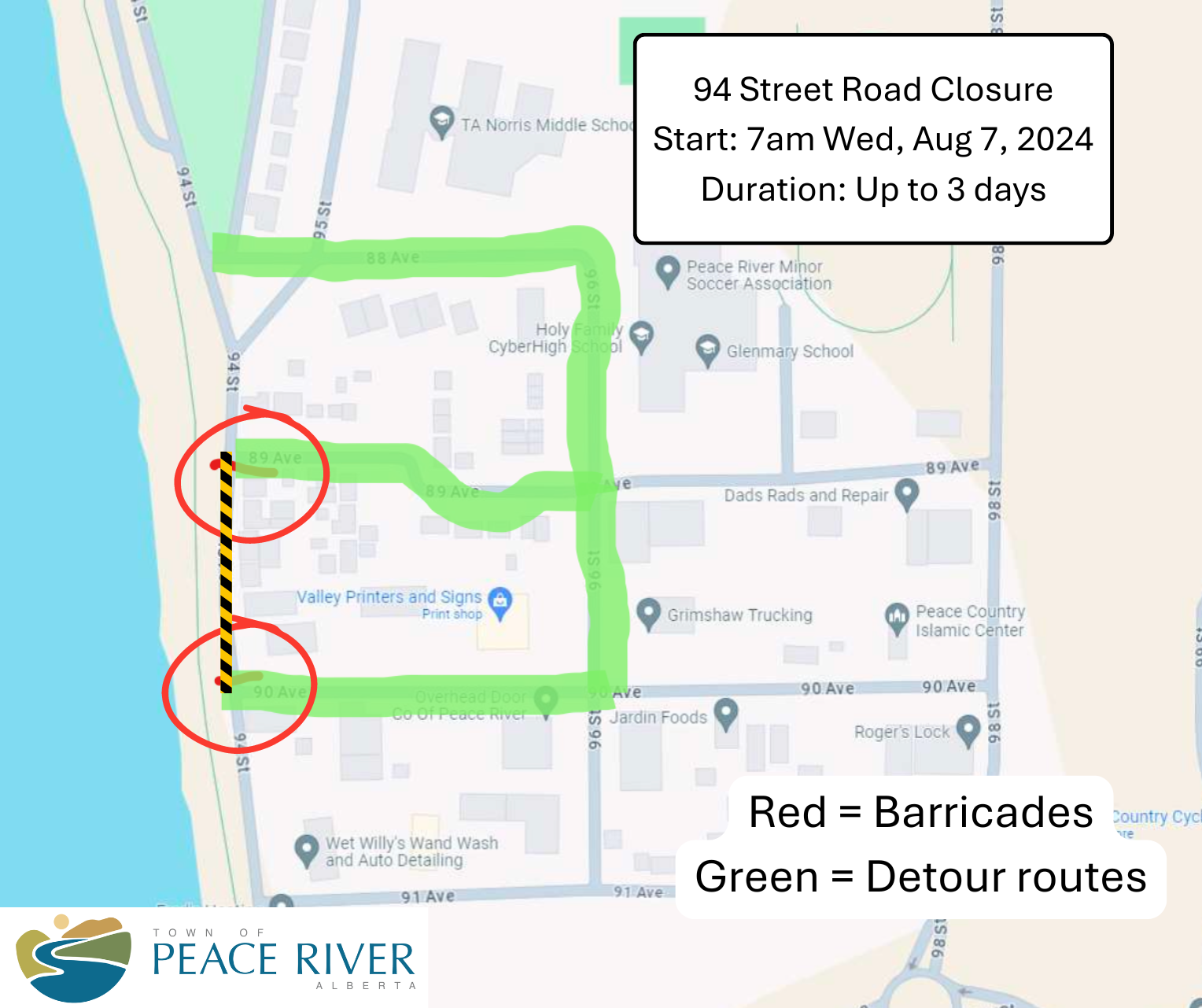 A portion of 94 Street will be closed starting August 7, 2024 to repair a water break.
