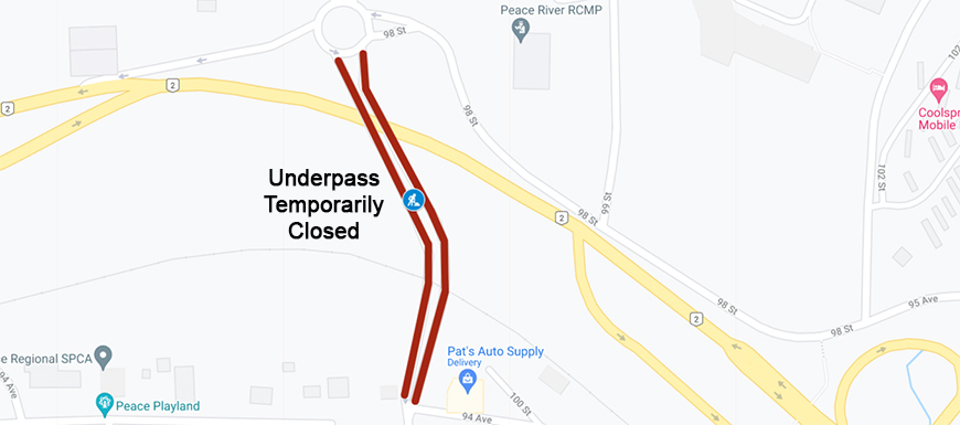 Flatiron-Aecon Joint Venture (FAJV) has extended the closure of 98 street under the Highway 2 overpass until June 11 due to construction delays. The purpose of the closure is to complete the remaining work on the bridge in that area. Barricades and signage will be installed to guide traffic. Road closure limits will be between Pat’s Auto Parts and the south exit of the new roundabout.