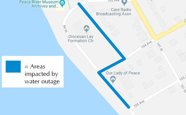 During construction work along River Road in the South End of Peace River a contractor accidentally damaged a water line. As a result, several areas are without water service right now including: 99 St. (River Road) between 105 Ave. and 104 Ave., along 104 Ave. from 99 St. to 100 St., and along 100 St. from 104 Ave. to 103 Ave.