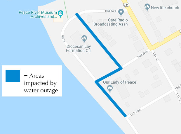 During construction work along River Road in the South End of Peace River a contractor accidentally damaged a water line. As a result, several areas are without water service right now including: 99 St. (River Road) between 105 Ave. and 104 Ave., along 104 Ave. from 99 St. to 100 St., and along 100 St. from 104 Ave. to 103 Ave.